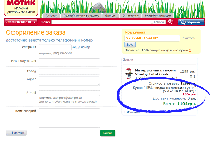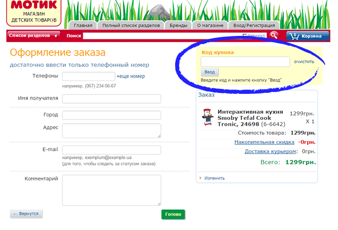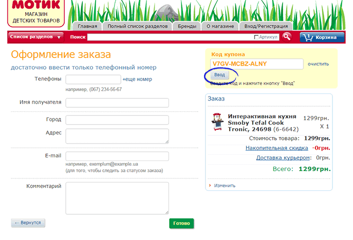 3. На странице Оформление заказа, ввести Код Купона в поле, которое расположено справа, в верхней части страницы, на желтом фоне